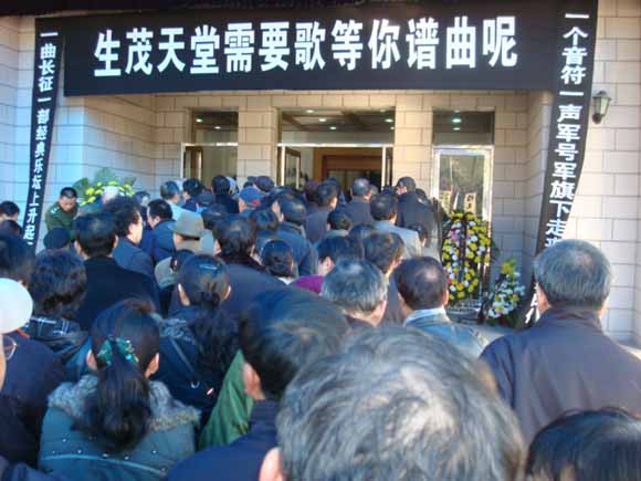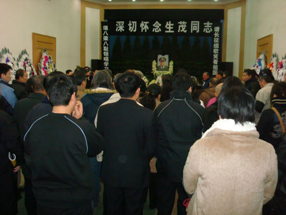 告别会上申会长 赵老师 苑董事长与社会各界人士默哀表示沉痛哀悼,接着在生茂先生生前谱写的音乐声中怀着沉痛的心情向 “一代音乐巨匠”的遗体告别.并带去由北大张振国教授连夜书写的三幅挽联:“悟先哲完善自我,会师意乐在人和”、“旋律生根沃土壮歌伴祖国步履同行,大师茂源繁花美曲随人民脉搏共鸣”、“音乐殿堂失巨臂,弥陀净土迎伯牙”。